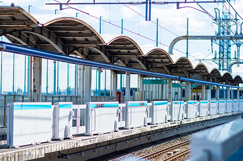 安全対策としてすべての駅のホームにホームドア(可動式ホーム柵)を設置しています。金城ふ頭駅はフルスクリーンタイプのホームドアです。