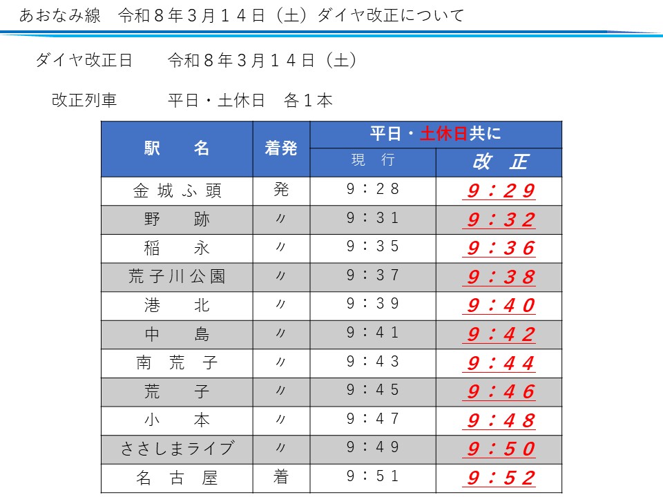 名古屋臨海高速鉄道(あおなみ線)では、令和8年3月14日(土)にダイヤ改正を行います。